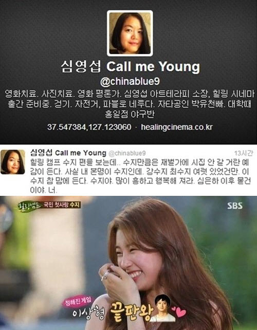 심영섭은 30일 자신의 트위터에 "힐링 캠프 수지 편을 보는데 수지만큼은 재벌가에 시집 안 갈 거란 예감이 든다"며, "사실 내 본명이 수지인데. 강수지 최수지 여럿 있었건만. 이 수지 참 맘에 든다. 수지야 많이 흥하고 행복해 져라. 심은하 이후 물건이야. 너"라는 글을 게재했다.