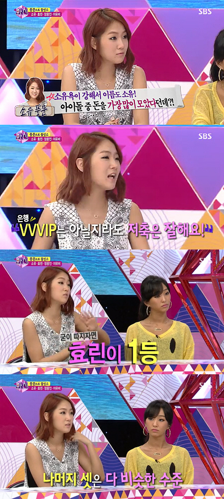 이날 소유는 '아이돌 중에 돈을 가장 많이 모아서 현금 재벌이고, 은행에서 VVVIP 대접을 받는다'는 소문에 대해 "VVVIP는 아니지만, 저축은 잘한다"고 말했다. 이어 "나는 돈이 들어오면 무조건 반은 저금한다. 돈을 쟁여두는 스타일이다"라고 설명했다.