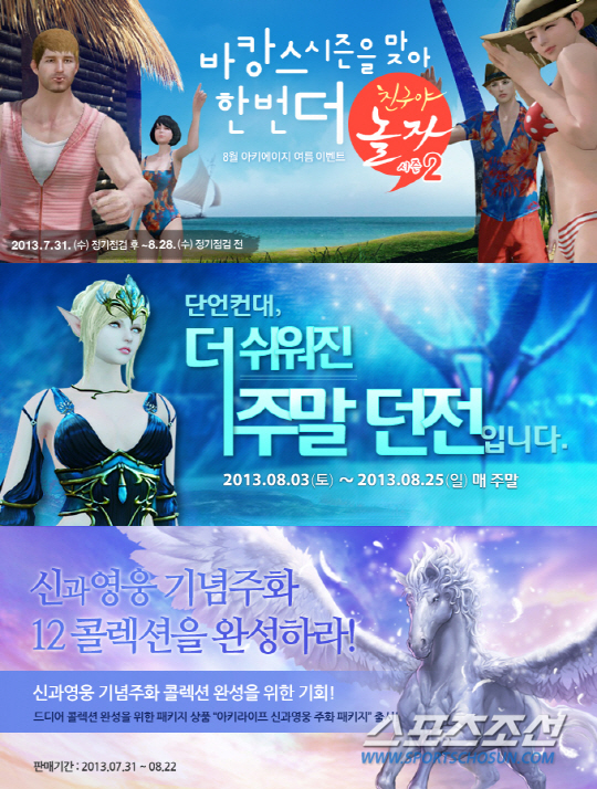 31일부터 8월 28일까지 열리는 '친구야 놀자' 이벤트를 통해 최초로 가입한 신규 유저에게는 캐릭터의 능력치를 올려주는 액세서리 아이템을, 지난 6월 19일 이후 접속기록이 없는 이용자가 게임에 접속하면 소환수 장비와 날틀이 담긴 '그리움의 선물 꾸러미'와 '아키라이프 10일 체험권'을 제공한다. '친구야 놀자' 이벤트와 함께 열리는 '함께 놀자, 친구야' 이벤트에서는 휴면 이용자를 많이 초대한 유저에게 지포스 GTX 680, 아이패드 미니 16GB 등 다양한 상품을 증정한다.