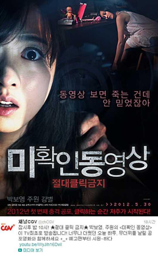 공포영화 '미확인 동영상 : 절대클릭금지'(이하 미확인 동영상)가 TV 최초로 방영, 누리꾼들의 관심이 쏠리고 있다.