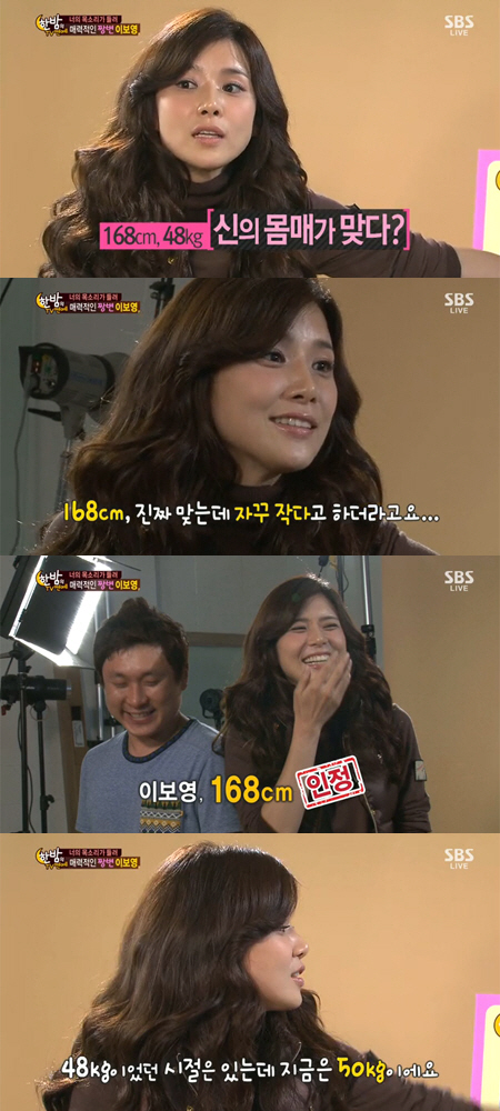 이에 키 168cm의 '한밤' PD는 이보영의 키를 증명하기 위해 옆에 나란히 섰고, 두 사람은 키 차이가 거의 없어 키 168cm임이 인정됐다.