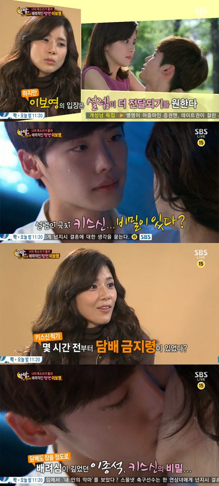 또 이보영은 "이종석에게 담배 금지령을 내렸다. 누나랑 찍기 3시간 전부터는 담배 피우지 말라고 금지령을 내렸다"며 키스신 비밀을 공개했다. 하지만 이내 "(방송에)나가면 안되냐?"고 조심스레 물었다.