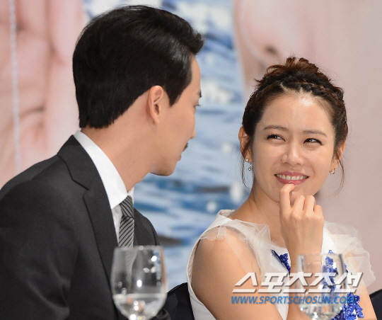 KBS 월화드라마 '상어'의 제작발표회에서 손예진이 김남길과 이야기를 나누며 웃고 있다. 정재근기자 cjg@sportschosun.com