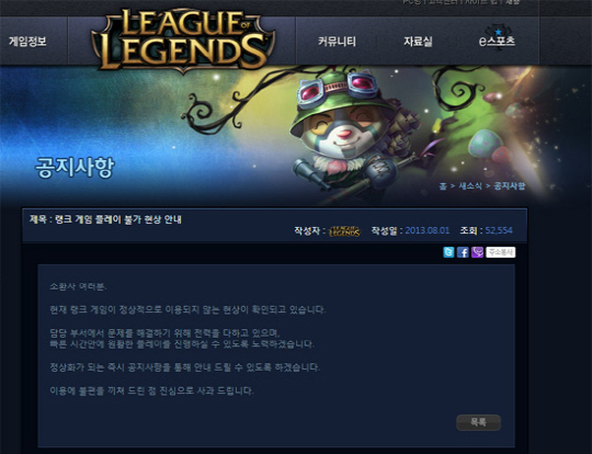 인기 온라인게임 '리그오브레전드'(이하 롤)가 서버 점검을 완료했지만, 게임이 정상적으로 이용되지 않아 유저들의 원성을 사고 있다.