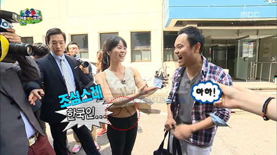 또한 이날 방송에서 맹승지는 개그맨 김민교의 인터뷰를 하던 중 바람에 상의가 날려 숨겨둔 애교뱃살을 살짝 노출해 시청자들의 눈길을 사로잡았다.