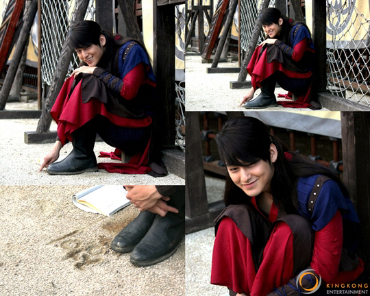 드라마 속 호위무사 의상을 입고 있는 김범은 긴 머리를 흩날리며 다리를 다소곳이 모든 채 바닥에 쭈그리고 앉아 있는 모습이다. 이어 김범은 손가락으로 모래위에 '정이'를 적어 놓은 채 자신의 글씨체에 만족한다는 듯 한 미소를 짓고 있어 여성들의 마음을 흔들고 있다.