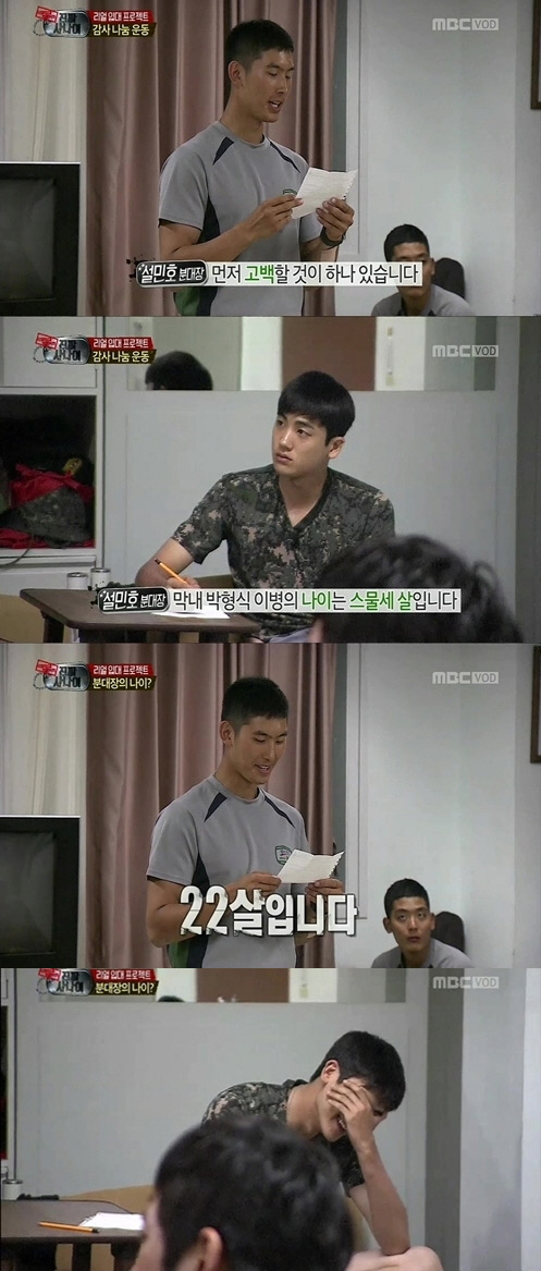 4일 방송된 MBC '일밤-진짜 사나이'에서는 체육대회를 마친 후 서로에게 감사의 마음을 전하는 시간에 나이를 숨겨왔던 설민호 분대장이 나이를 깜짝 공개해 눈길을 끌었다.