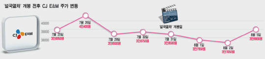 '설국열차' 제작비 전액을 댄 CJ E&M 주가는 이로 인해 지난달 18일 장중 4만1000원까지 오르며 1년 신고가를 새로 썼다. 하지만 언론 시사회가 열린 지난달 23일에는 4%대 급락하기도 했다. 더불어 1000만명을 향한 흥행 기록 릴레이를 펼친다고 해도 주가는 확 오르지 않는다. 이미 어느정도 예측 가능했던 결과이기 때문이다.