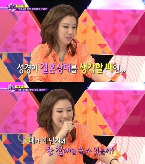 이어 김성경은 동료 김현욱이 배우자로 어떤지를 묻는 말에 대해 "이게 방송이 나갈지 안 나갈지 모르겠는데 나는 결혼상대를 생각할 때 '내가 이 남자와 한침대를 쓸 수 있을까'를 생각해본다"며 "김현욱 씨는 나란히 의자에 앉아서 얘기하는 상대다"라고 말해 웃음을 자아냈다.