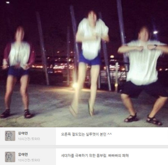 이에 유아인은 편안한 차림으로 안무를 소화하고 있는 본인을 가리켜 "오른쪽 절도 있는 실루엣이 본인"이라는 글을 덧붙여 웃음을 자아내게 한다.