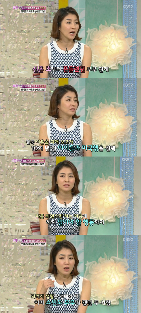 그는 "이미 미국 떠날 때 남편과 서로 '좋은 여자, 좋은 남자 만나라'고 말하고 떠났다. 호적상 보이는 부부였지만 우린 이미 부부가 아니었다"고 강조했다. 이어 "둘째 임신하면서 나는 이 사람을 이미 마음에서 접었다. 그때부터 내 남편이 아니라고 생각하고 살았다. 미국 떠날 때도 별거할 때도 서로 좋은 사람 만나라고 말했다"며 두 사람의 관계가 이미 오래전부터 어긋났음을 밝혔다.