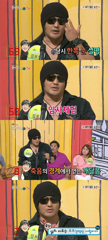 김보성은 "그때 날 구해준 분이 계셔서 과거 'TV는 사랑을 싣고'에서 찾기도 했다. 그 이후에도 나는 죽을 고비가 수없이 많았다"며 "죽음의 경계에서 얻은 깨달은 것은 삶의 이유가 무조건 적인 사랑이라는 것이다"라고 자신의 생각을 밝혔다.