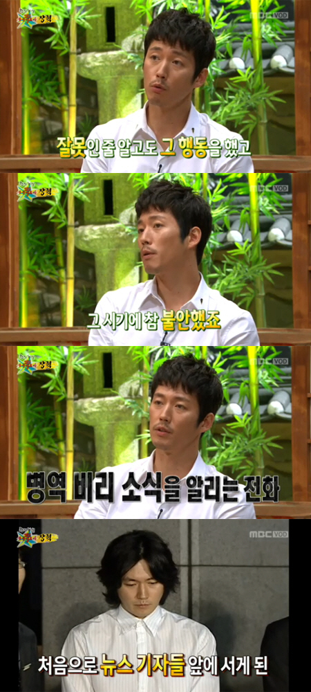 그는 "다시 병무청에 가서 신검을 받고 처음으로 뉴스 기자들 앞에 서게 됐는데 어떤 말을 해야 할지도 모르겠더라. '잘못했습니다. 죄송합니다. 다시는 이런 일 없이 잘하겠습니다'라고 하는데 목이 메어 잘 나오지 않았다"고 털어놨다. 이어 "제일 먼저 생각이 난 건 부모님이었다. '우리 부모님도 보고 계실 텐데...'라는 생각이 들었다. 어디 숨을 곳도 없고 감당이 안 되더라"고 토로했다.