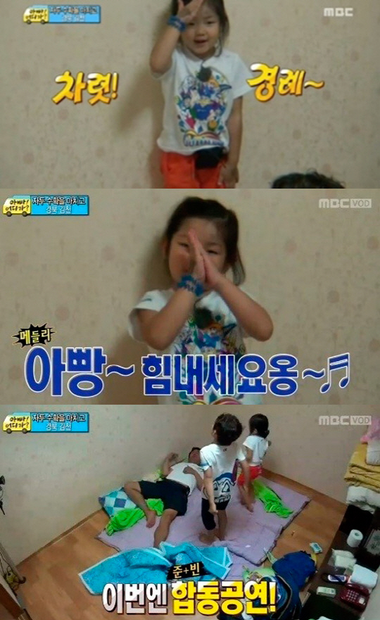 이어 성빈은 갑자기 벽으로 가 "차렷 경례"라며 성동일에 인사를 하더니 애교를 부리며 깜찍한 춤과 함께 "아빠 힘내세요"를 열창, 이에 오빠 성준까지 가세해 흥을 돋우며 성동일을 기쁘게 했다.