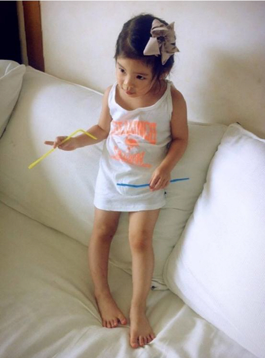 공개한 사진 속 뮤지 딸은 흰색 민소매 차림에 양 손에는 빨대를 한 개씩 들고 소파위로 올라 서 있다. 특히 머리에 꽂은 큰 리본핀과 큰 눈망울이 귀여움을 더하고 있다.