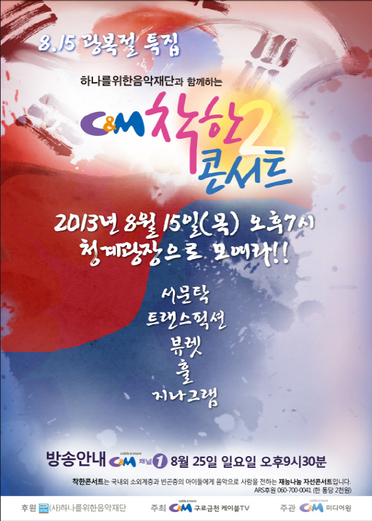 수도권 최대케이블TV방송사 ㈜씨앤앰(cable & more, 대표 장영보)이 8월 15일 광복절을 맞아 특집 '착한콘서트 시즌2'를 개최한다.