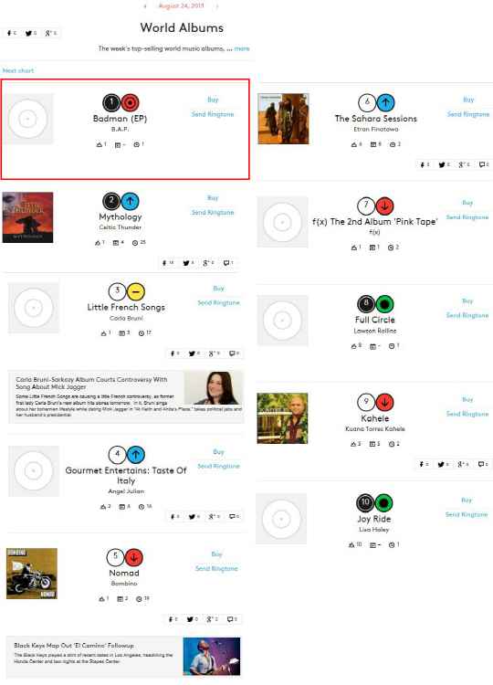 최근 발표한 미니 앨범 3집 'BADMAN(배드맨)'으로 아이튠즈 힙합 앨범 차트(iTunes Store Top 10 Hip-Hop Albums)에서 미국 1위, 일본 2위 등 세계 각국의 차트에서 상위권에 오르며 화제를 모아온 B.A.P가 이번에는 8월 15일 발표된 8월 24일자 미국 빌보드 월드 앨범(World Albums) 차트에서 1위를 차지했다.