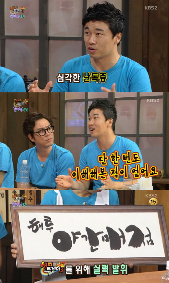 조달환은 지난 15일 방송된 KBS2 '해피투게더3'에 출연해 '야간매점' 현판을 캘리그래피(손으로 그리는 그림문자)로 직접 쓴 것을 공개, MC들 및 게스트들은 탄성을 자아냈다.