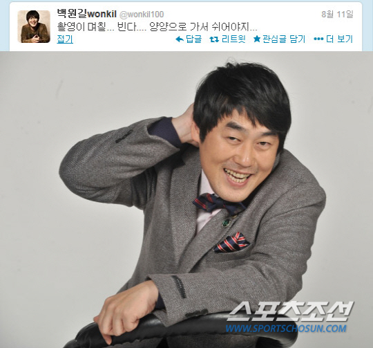 이에 앞서 백원길은 지난 11일 자신의 트위터에 "촬영이 며칠 빈다. 양양으로 가서 쉬어야지"라는 글을 게재하며 휴식차 양양으로 떠난 사실을 알렸다.