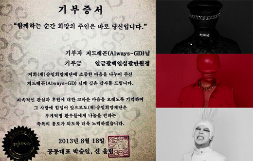 '승일희망재단'은 지누션의 션과 루게릭병을 앓고 있는 전 농구선수 박승일이 공동대표로 있는 루게릭요양병원 건립을 위한 재단. 지드래곤은 같은 소속사 선배 가수인 션을 통해 그동안 자신에게 큰 사랑을 준 팬들에게 보답하는 의미로 이번 기부를 결정했다고 밝혔다.