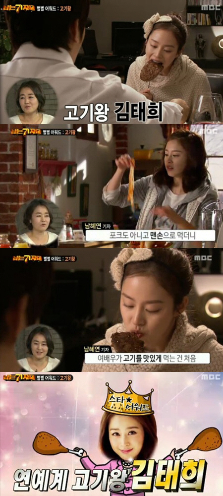 이어 "들은 바로는 김태희가 '장옥정' 촬영장에 족발이 배달되자 맨손으로 족발에 김치까지 먹었다고 한다. 현장에 있던 관계자가 '여배우가 그렇게 먹는 것을 처음 본다'고 했다"고 말했다. 이어 "하정우의 '먹방'을 이길 것"이라며 김태희를 고기왕으로 선택했다.