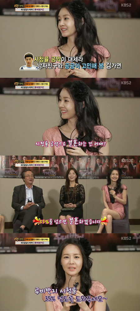 이에 김가연은 "요즘 시청률 공약이 대세라 남자친구(임요환)와 고민을 해봤다"며 "우리 드라마가 어느 정도 시청률을 넘으면 결혼하는 건 어떠냐고 물어봤다"고 말해 놀라움을 샀다.