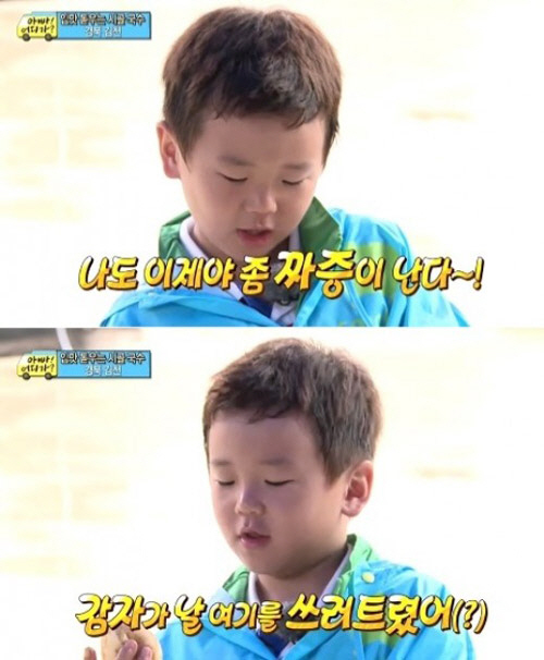 이에 윤후는 즐겁게 감자를 깎으며 "나 껍질 많이 깠어. 재밌는데 아빠는 뭐가 짜증이 난다는거야?"라고 말했다. 이어 "재밌네 뭐~ 아빠는 미끄러웠구나? 미끄러워서 짜증났구나?"라며 해맑은 웃음을 지었다.