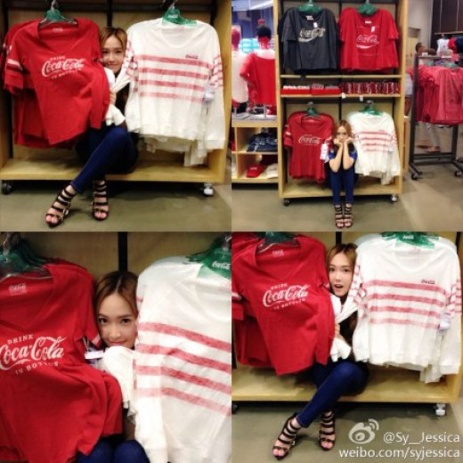 사진 속 제시카는 빨간색과 하얀색 티셔츠가 진열돼 있는 옷장에 앉아 옷으로 몸을 가린 후 얼굴만 내놓은 채 사진 촬영에 여념이 없는 모습이다.