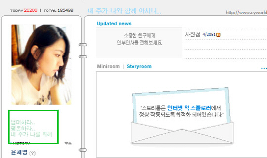 윤채영은 19일 자신의 미니홈피에 "담대하라. 평온 하라. 내 주가 나를 위해 애쓰심"이라는 글을 남겼다.