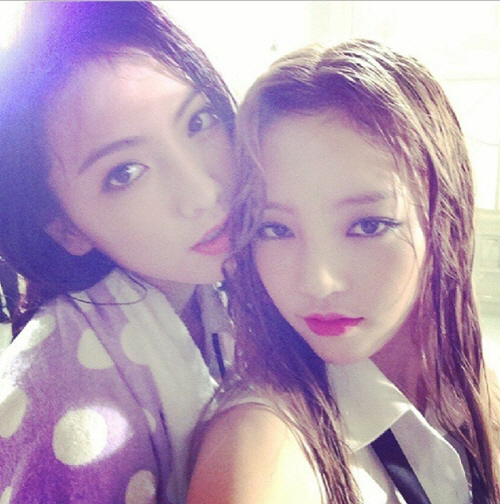 사진에는 구하라와 강지영이 다정하게 얼굴을 밀착한 채 요염한 자태로 카메라를 응시하고 있는 모습이 담겨 있다. 두 사람 모두 흠뻑 젖은 머리에 짙은 메이크업으로 섹시한 매력을 한껏 발산해 눈길을 끈다.