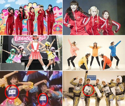 해당 게시물에서는 크레용팝과 모모이로 클로버Z의 콘셉트를 비교했다. 5명의 멤버로 구성된 크레용팝과 모모이로 클로버Z는 빨간색 트레이닝복과 헬멧 등을 똑같이 착용하고 있는 모습.