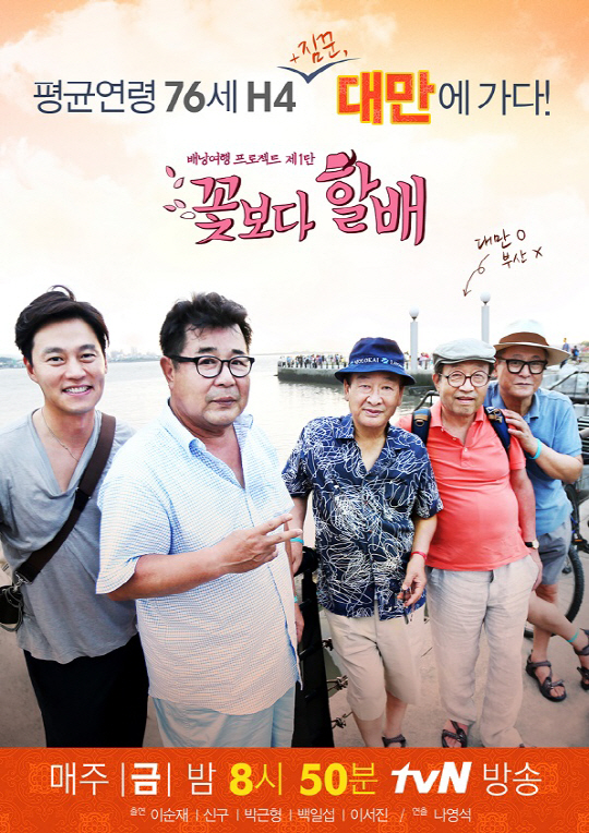 오는 23일 오후 8시50분 첫 방송을 앞둔 '꽃보다 할배' 대만편의 공식 포스터에는 여름 옷으로 갈아입은 H4 멤버(이순재, 신구, 박근형, 백일섭)와 짐꾼 이서진이 대만의 대표적 여행지인 단수이를 배경으로 포즈를 취한 모습이 담겨있다.