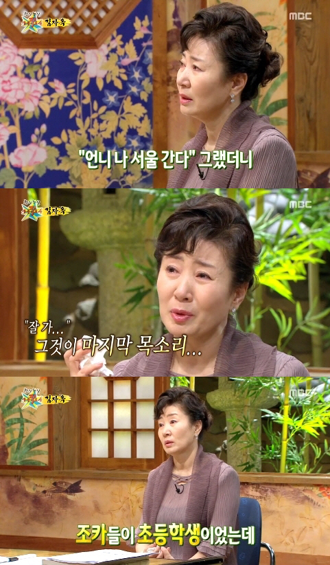 이날 김자옥은 "큰언니가 우울증이 너무 심해 스스로 생을 마감했다. 나와 제일 친했던 언니인데 보고 싶다"며 눈물을 흘렸다.
