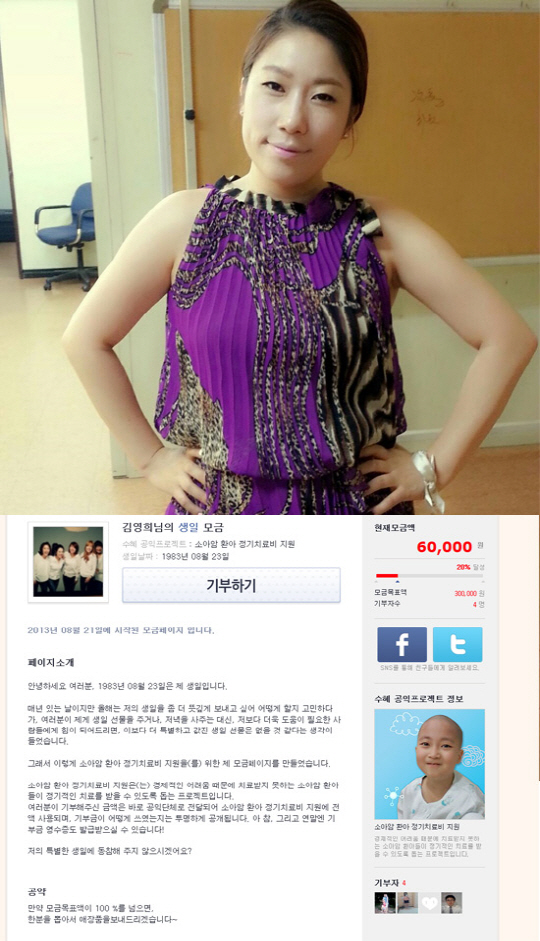 김영희는 지난 22일 자신의 트위터에 "1983년 8월 23일은 제 생일입니다. 매년 있는 날이지만 올해는 저의 생일을 좀 더 뜻 깊게 보내고 싶어 어떻게 할지 고민하다가, 여러분이 제게 생일 선물을 주거나 저녁을 사주는 대신 저보다 더욱 도움이 필요한 사람들에게 힘이 되어 드리면, 이보다 더 특별하고 값진 생일 선물은 없을 것 같다는 생각이 들었습니다"라며 "그래서 이렇게 소아암 환아 정기치료비 지원을 위한 제 모금 페이지를 만들습니다"라는 글과 함께 비카인드 생일 모금 웹사이트 주소를 게재했다.