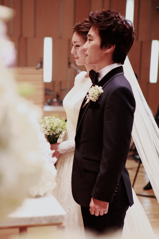 김정화는 지난 24일 서울 동숭교회에서 CCM 가수이자 작곡가 유은성과 소박한 결혼식을 올렸다. 공개된 본식 사진 속 김정화와 신랑 유은성은 서로 사랑하는 신랑, 신부의 행복함이 가득 묻어난 모습이다. 여성스럽고 단아한 레이스가 돋보이는 순백의 웨딩드레스를 입은 김정화의 모습과 세련된 수트 정장을 입은 신랑 유은성의 모습이 한 폭의 그림처럼 아름답다.