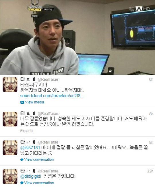 이에 타래도 '디스전'에 참여 하는 것이 아니냐는 팬들의 관심에 그는 "전쟁은 안합니다"라며 트위터에 답글을 남기기도 했다.