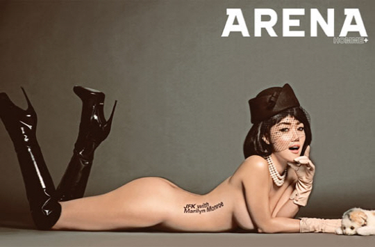 패션 매거진 '아래나 옴므 플러스' 9월호 화보에서 낸시랭은 롱부츠와 모자만 착용한 채 실오라기 하나 걸치지 않은 과감한 전신 누드를 찍었다.