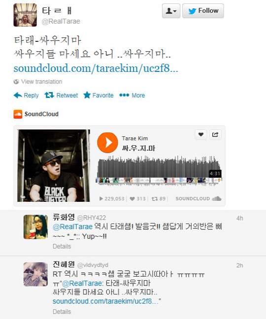 25일 타래는 자신의 트위터에 '싸우지마'라는 자작랩을 공개하며 "싸우지들 마세요. 아니 싸우지마"라는 짧은 글을 남겼다.