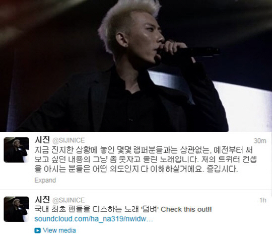 시진의 '덤벼'에는 '남친이 생기려면 어떻게 해야하는 게 아니라 어떻게 생겨야 되는 거야', '나처럼 팬들 생각하는 래퍼도 없겠다. 고마우면 노래를 사야지. 지난 7월에 '흐리고 비' 나왔을 때 알지? 너네 트위터에선 나를 사랑한 댔잖아'라며 팬들에게 감정을 드러내는 가하면, '어차피 나와 엑소(EXO)가 물에 빠지면 너흰 엑소를 구할 거고 너희가 물에 빠지면 난 3D 안경 쓰고 팝콘 먹으며 구경 할 거야'라며 아이돌 그룹에 대한 질투를 드러내기도 했다.
