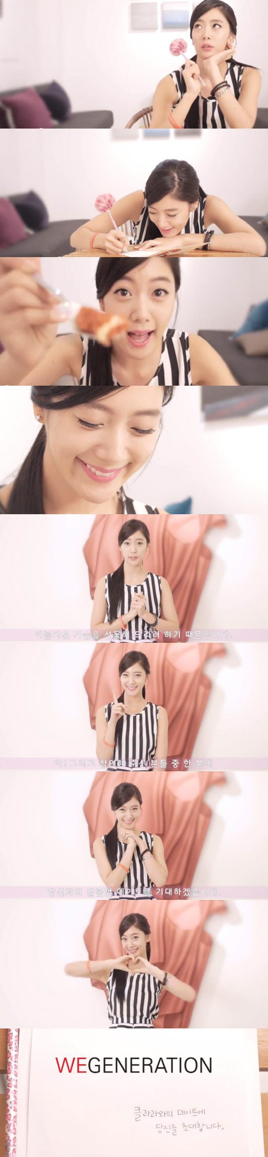 이 캠페인을 소개하는 유튜브 영상 속 클라라는 '어떻게 글을 쓸까' 고민하는 모습부터 상대방에게 케이크를 떠먹여주는 모습까지 청순하고 상큼한 이미지를 과시하고 있다. 또 캠페인에 대한 소개를 마친 클라라는 손으로 하트를 그리며 '나와 데이트 해주실 분'을 찾아 남성팬들의 마음을 설레게 하고 있다.
