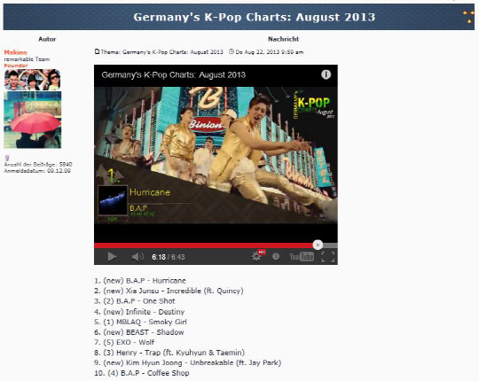 지난 22일 발표된 8월 독일 K-POP차트(German's K-Pop Charts)에서 B.A.P가 'Hurricane(허리케인)'으로 진입과 동시에1위를 차지하는 기염을 토했다. 이로서 B.A.P는 데뷔와 함께 연속 19개월 째 독일 아시안 음악 차트 톱 10 진입과 더불어 통산 7회 1위를 차지하는 전무후무한 기록을 세우게 되었다. 이 차트는 매달 독일 현지 팬들의 투표로 순위를 결정, 독일 내 실질적인 인기를 가늠할 수 있는 대표 차트이다.