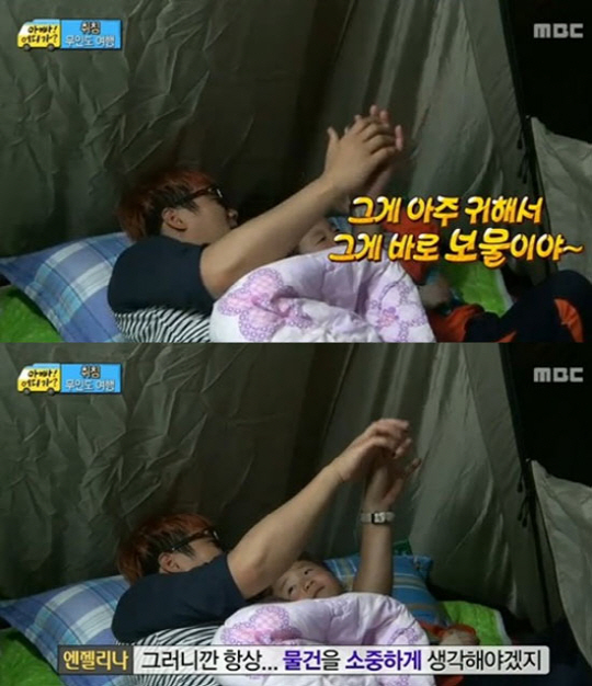 25일 방송된 MBC '일밤1부-아빠어디가'에서는 윤민수가 아들 윤후에 눈높이에 맞춘 교육을 하는 모습이 그려졌다.
