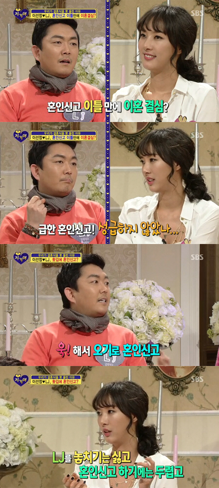 이에 대해 LJ는 "고민이 돼서 구청에 전화해 물어봤더니 20~30분 안에 서류 팩스 전송되고 법적 부부가 되기 때문에 이혼해야 취소가 된다고 했다"고 설명했다.