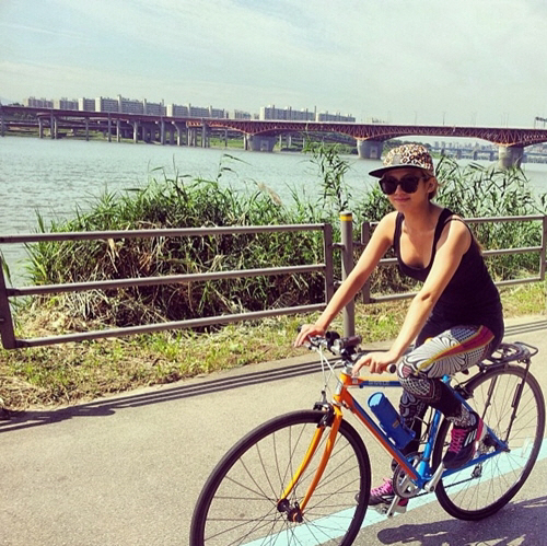 공개한 사진에는 효연이 한강 공원에서 자전거를 타고 있는 모습이다. 심플하면서도 남다른 감각을 자랑하는 효연의 라이딩 패션은 검은색 민소매에 호피무늬 모자와 화려한 프린트가 새겨진 팬츠를 매치했다.