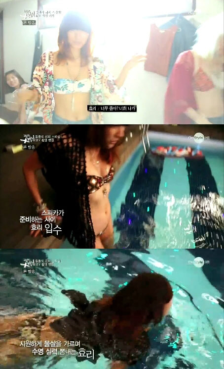 이효리는 8월27일 방송된 온스타일 '이효리의 X언니'에서 프로듀싱을 맡은 걸그룹 스피카가 뮤직비디오 촬영을 준비하는 동안 야외 수영장에 입수했다.