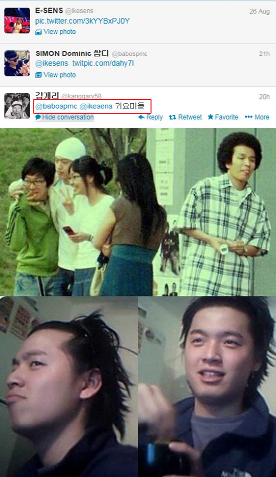 개리는 27일 자신의 트위터에 "귀요미"라는 짧은 댓글을 남겼다. 이는 '힙합 디스전'을 벌이고 있는 이센스와 사이먼디가 서로의 과거 굴욕사진을 게재한 것에 대한 댓글을 남긴 것.