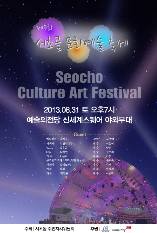 8월31일 오후 7시 예술의전당 신세계스퀘어 야외음악무대에서 열리는 '제3회 서초골 문화예술축제'는 서초1, 2, 3, 4동 주민자치위원회 주최로 진행되면, 서초지역문화예술인들의 재능기부로 꾸며진다. 1부는 김동수 교수의 지휘에 맞춰 50인조 서울뮤즈윈드오케스트라의 아름다운 공연과 함께 국내 유명 성악가 테너 임웅균, 소프라노 박정원 교수가 클래식 음악을 선사한다. 2부와 3부는 국내 최정상 대중가수들의 무대가 펼쳐진다. 영원한 청춘의 아이콘 남진, '잊혀진 계절'의 이용, '갈색추억'을 부른 한혜진, '이별 아닌 이별'의 주인공 이범학 등이 출연해 2부 무대를 꾸미고, 3부에서는 맨발의 디바 이은미, '네버엔딩스토리', '희야' 등 주옥 같은 음악을 만든 부활, 그리고 '천년의 사랑'을 부른 감성 록커 박완규가 화려하고 파워풀한 무대로 대미를 장식한다.