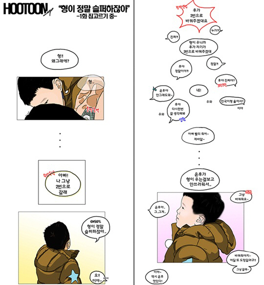 지난 29일 디시인사이드에는 "후툰 HOOTOON '형이 정말 슬퍼하잖아 -1화 집고르기 중-'"이라는 제목으로 짧은 웹툰이 게재됐다.