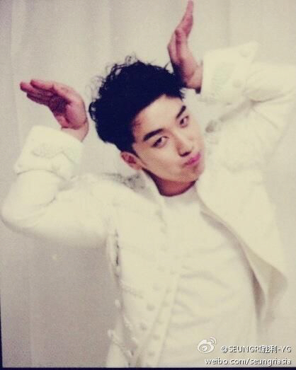 사진 속 승리는 양손을 토끼의 귀처럼 만들고, 볼에는 바람을 넣어 애교 넘치는 표정을 지었다. 여기에 올 화이트 패션은 승리의 매력을 한껏 더 강조했다.