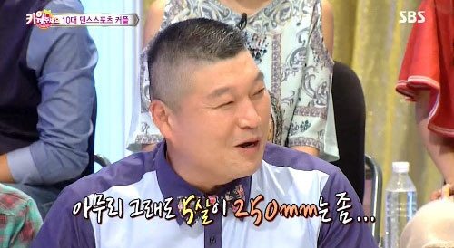 강호동은 "우리 아들이 밥을 세그릇 먹는다. 발이 250mm이다"고 주장해 웃음을 자아냈다.